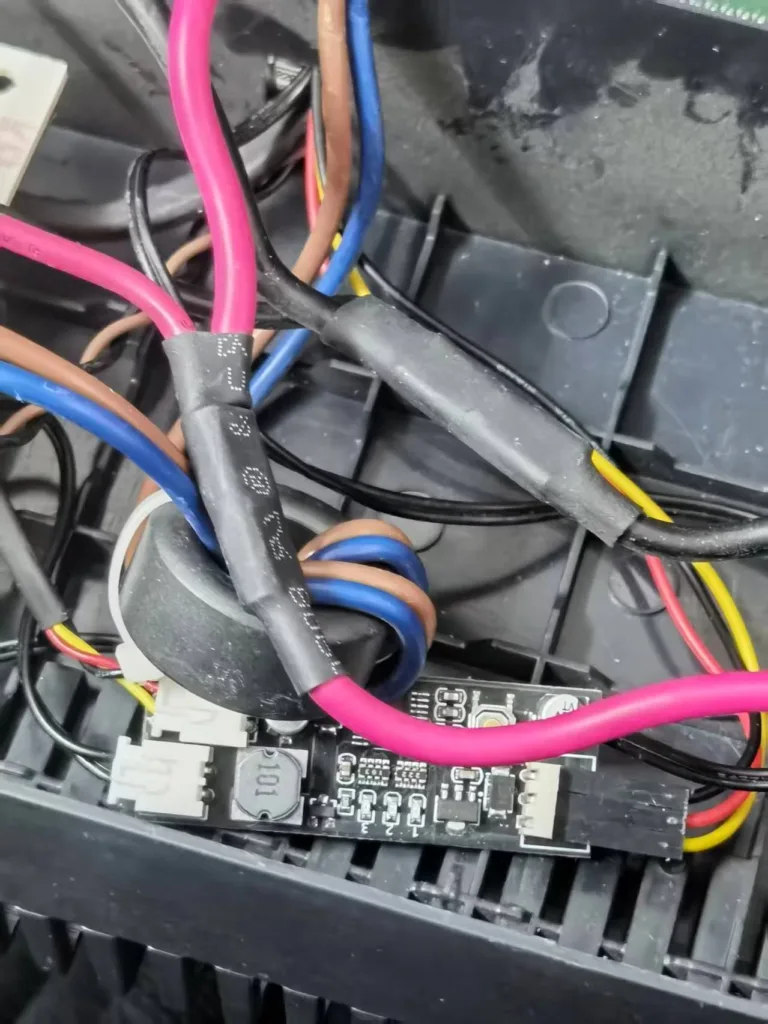 上图你也可以看到,设备本身显示似乎是有温度传感器的但这个温度不管夏天还是冬天都是 25 度,说明可能哪里有问题,或者压根没有温度传感器,所以就导致这个风扇每当启动但凡在转都是满转,有噪音,所以说那肯定要做一下优化,这个风扇是 ups 当市电过低或者过高进入升降压,又或者是断电进入逆变模式时候才会工作,然后正好断市电再重新连接好像风扇会自动延时运行 10 分钟于是我就上网购买了三线风扇的温度调速板,把温度传感器固定在风扇对着吹的 mos 管这个大功率带散热片的元件上,手动触发风扇启动然后调了风扇风量还挺大但是声音基本远了听不到的程度作为最低转速,这样夏天会自动根据需要进行提速降速,保证了安全性也让它的风扇支持了智能温控。