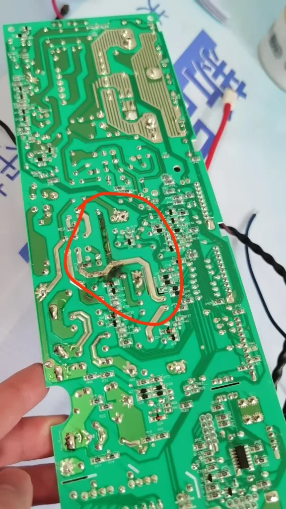 当工程师小哥拆除整块主板的时候一切都明了了,原来,背面不知什么原因电路板的一条铺铜线路直接烧断,在背壳上留下了糊印,可能是阻燃材料原因,糊印出奇地小,外壳看还是里面看都属于那种一层碳粉的级别,随便一擦就根本看不出区别,这才影响了我的观察和判断,那这种问题到底是人为原因还是什么其他原因具体真的也不可考证了,所以一笔带过。